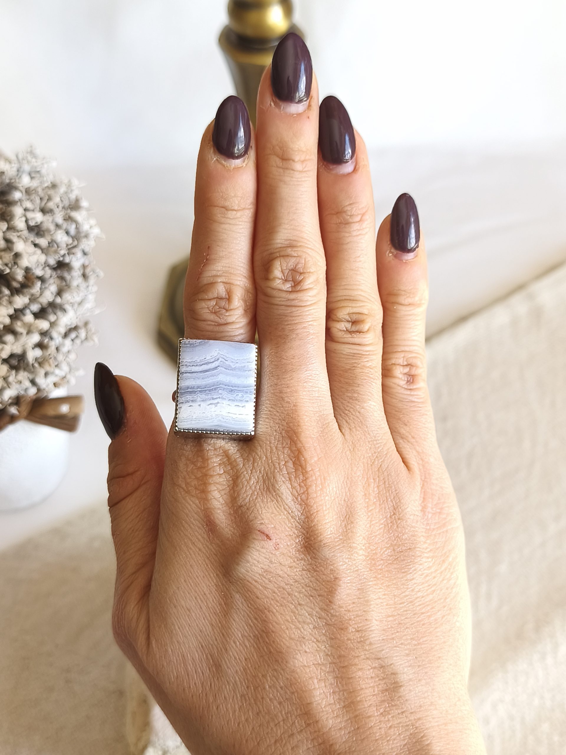 Os anéis representados na fotografia são exemplares. Sendo anéis de pedra natural, podem variar a cor, tamanho e formato.
