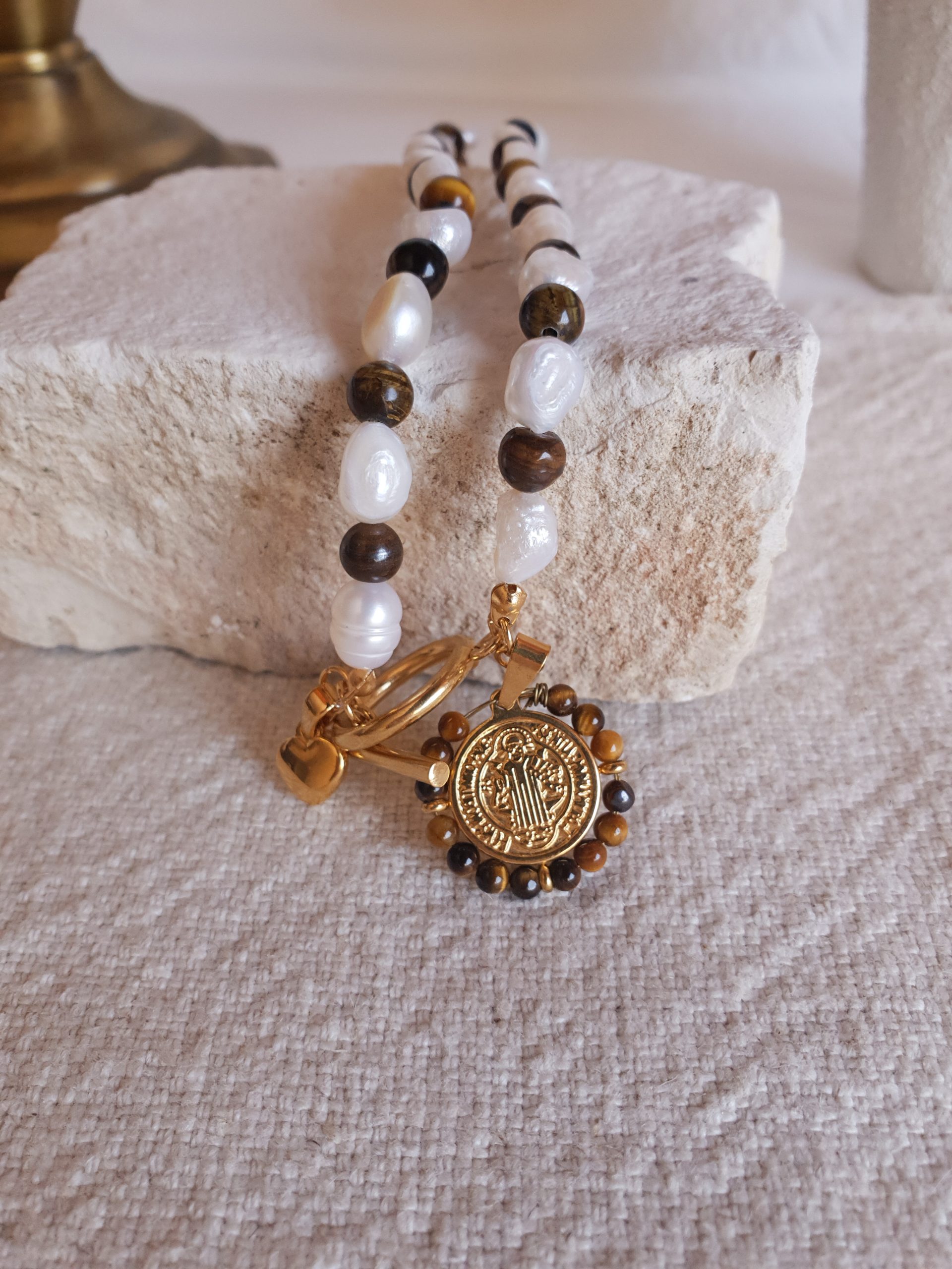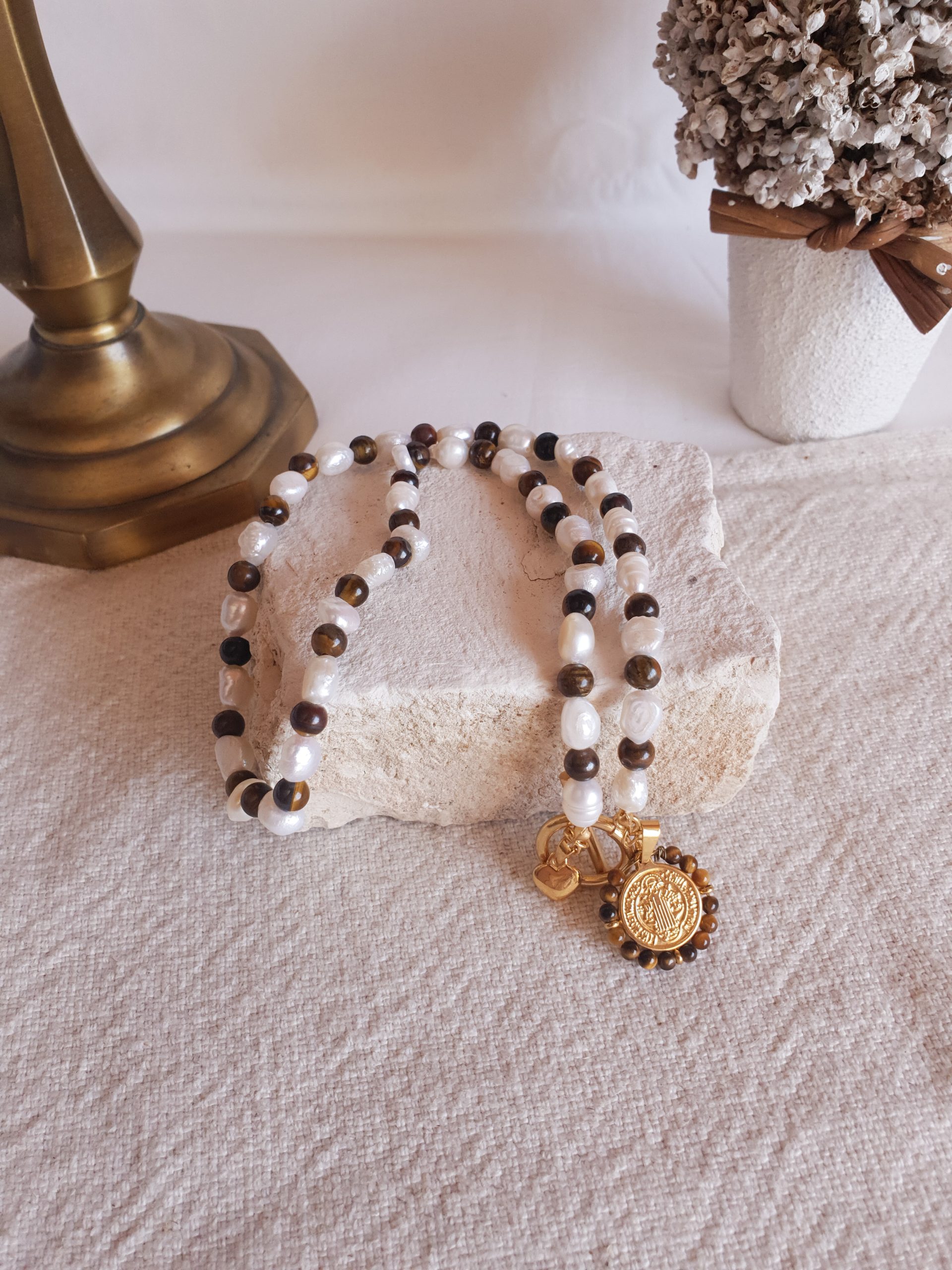 Colar Nossa Senhora das Graças (Olho de Tigre e Pérola)