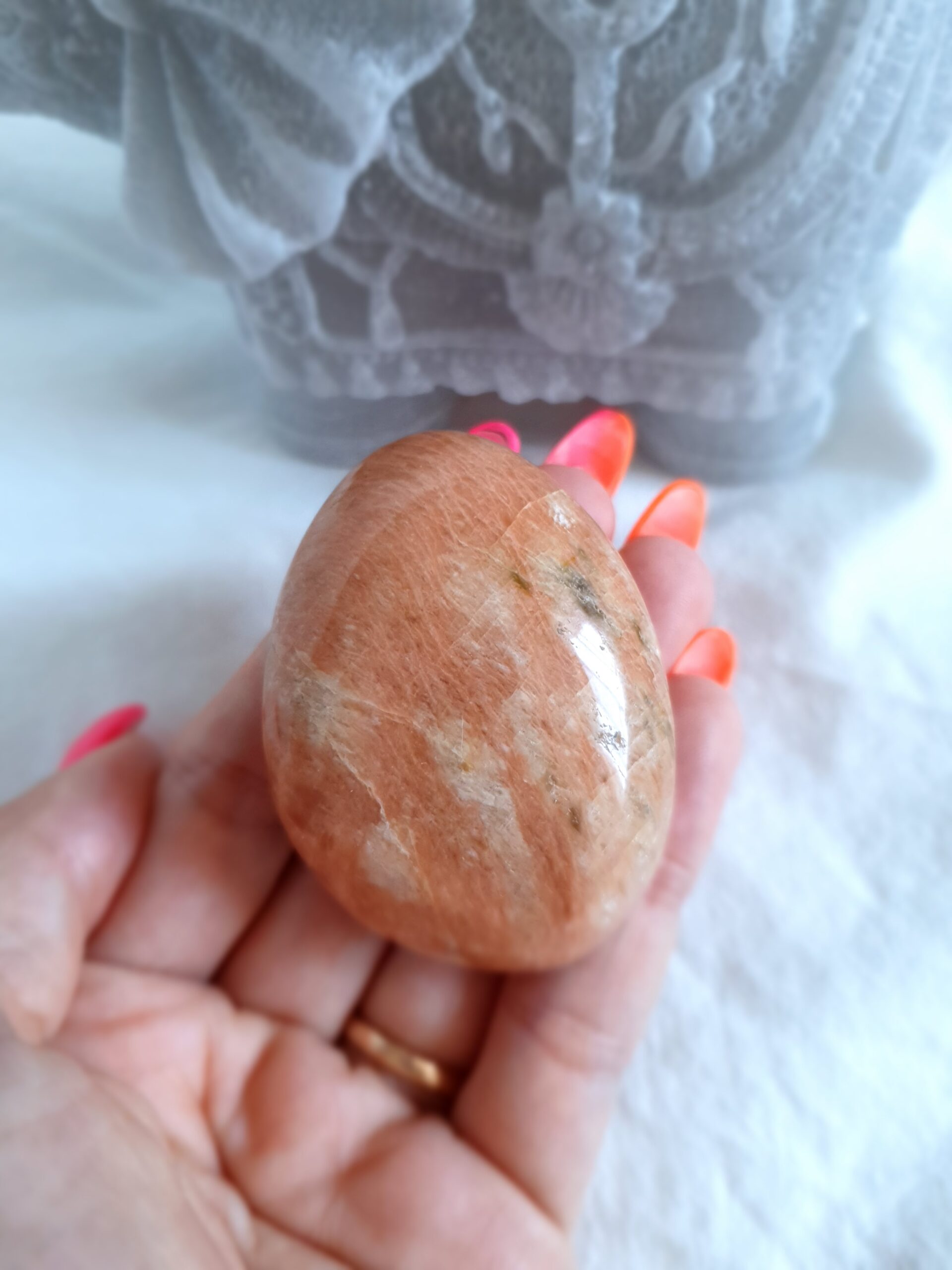 - Conexão com a Energia Lunar: A Pedra da Lua Pêssego tem uma afinidade poderosa com a lua, trazendo a influência calmante da noite para a tua vida. Além disso, ela sintoniza-te com os ritmos naturais da vida e ajuda-te a fluir nas marés da mudança.