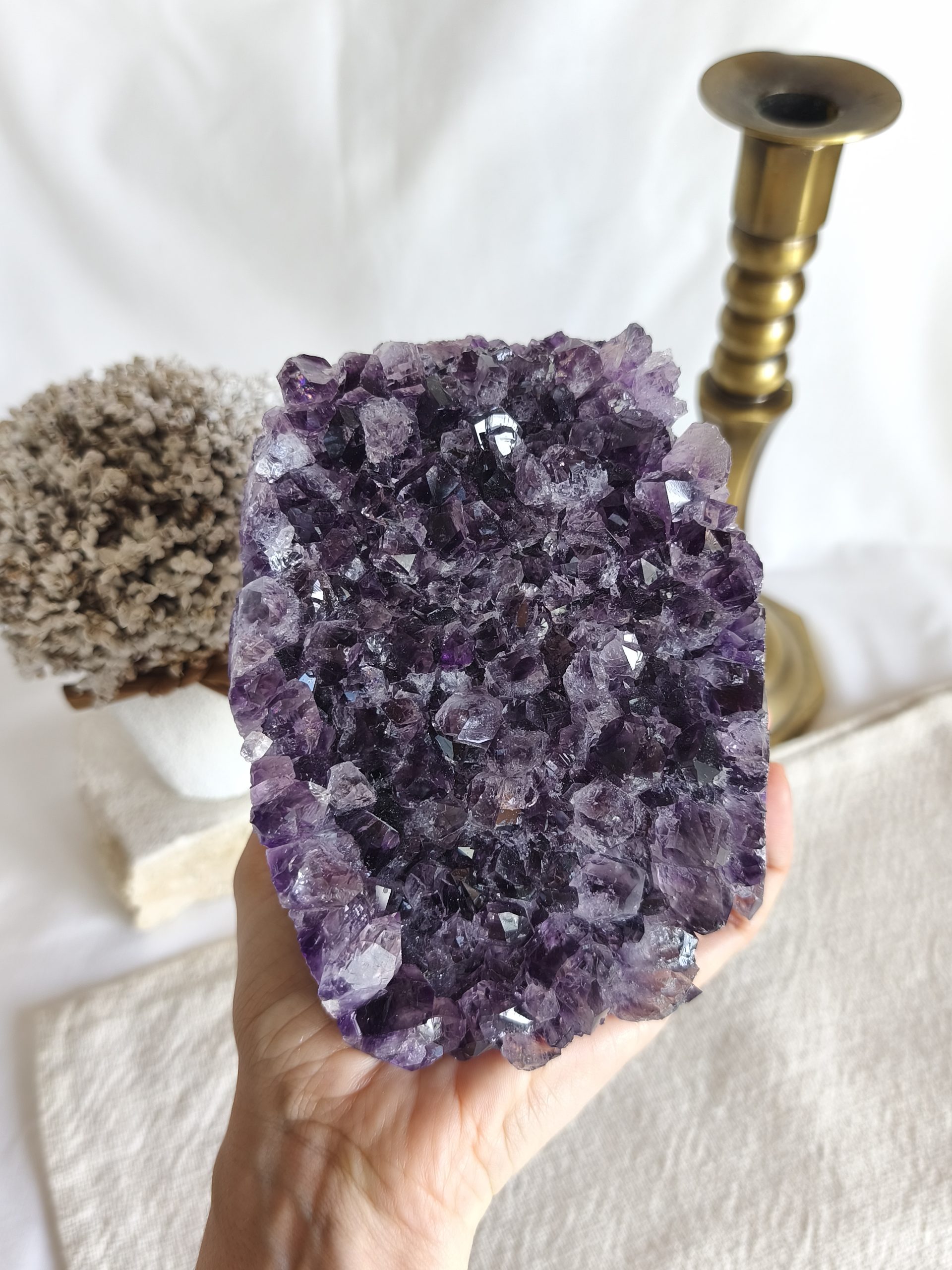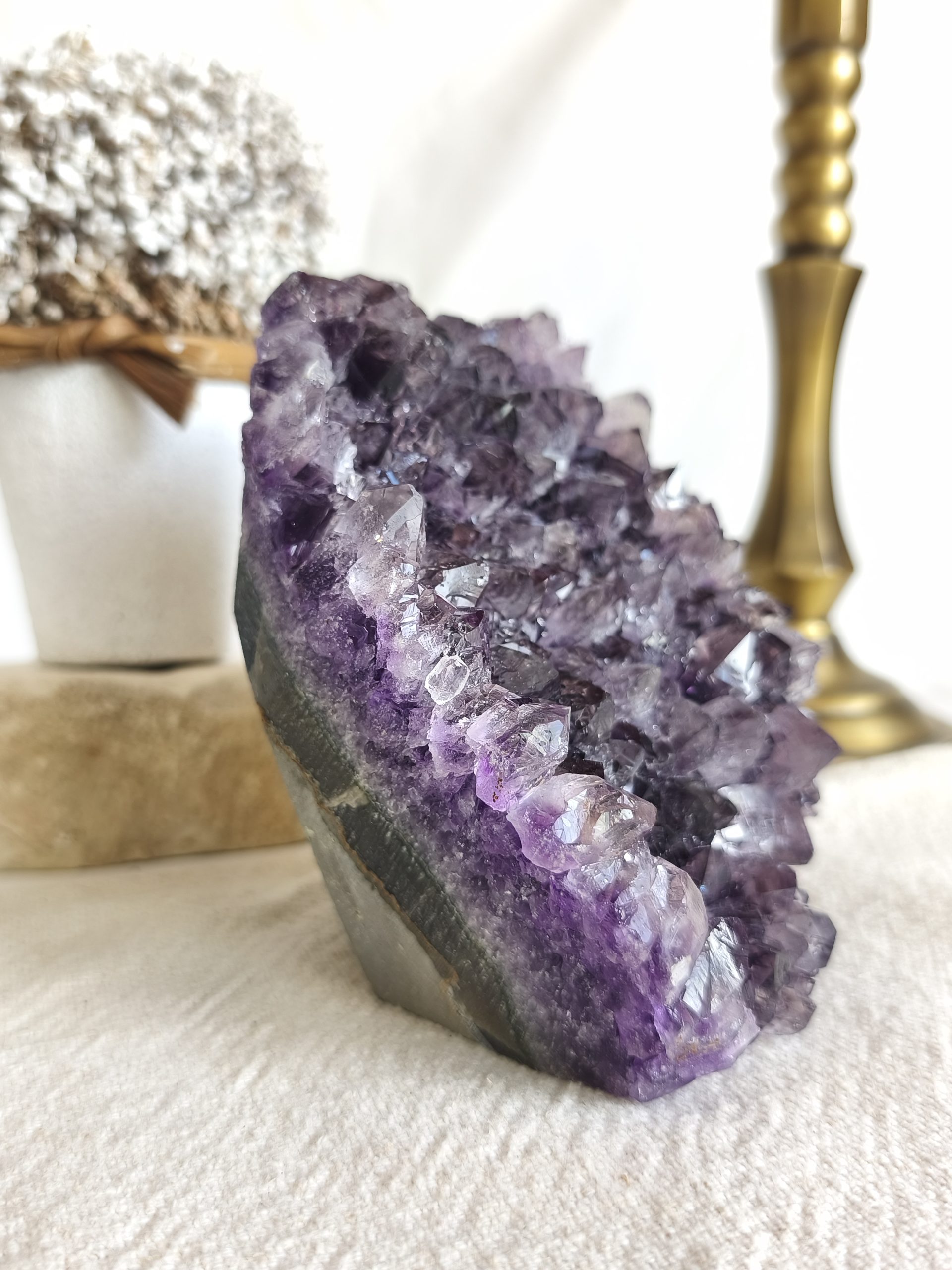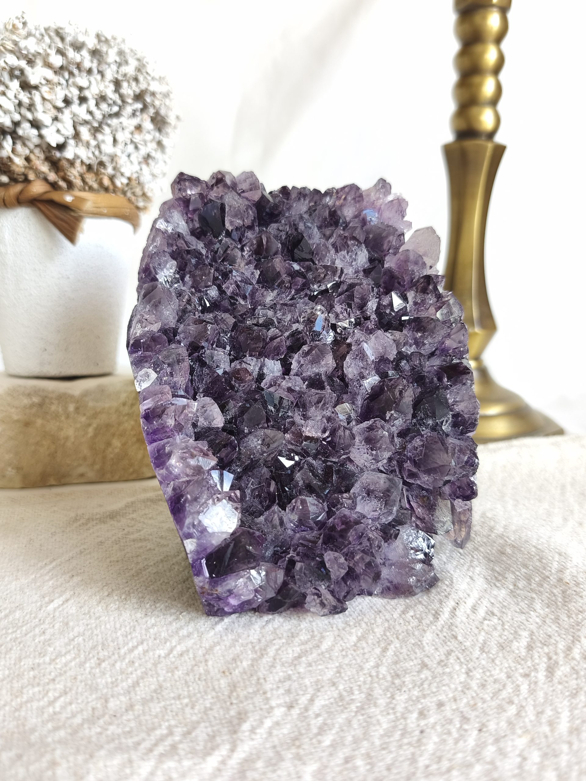 A Ametista é conhecida pela sua deslumbrante coloração roxa, que transmite uma sensação de tranquilidade e espiritualidade. Ainda mais, quando esculpida numa Drusa, a Ametista revela toda a sua majestade natural. Nesse sentido, cada Drusa é única, com cristais brilhantes e facetas que captam a luz de maneira deslumbrante.