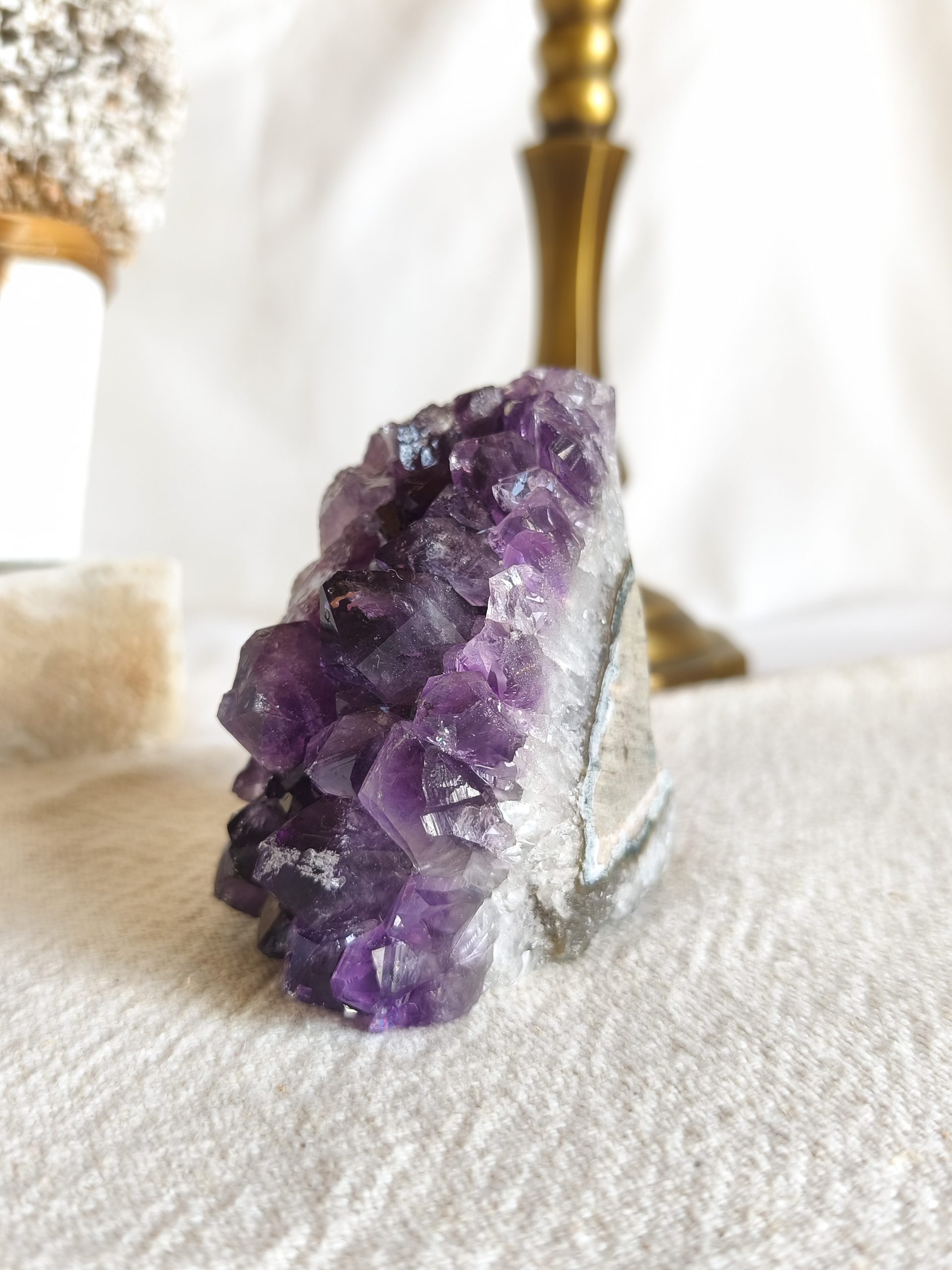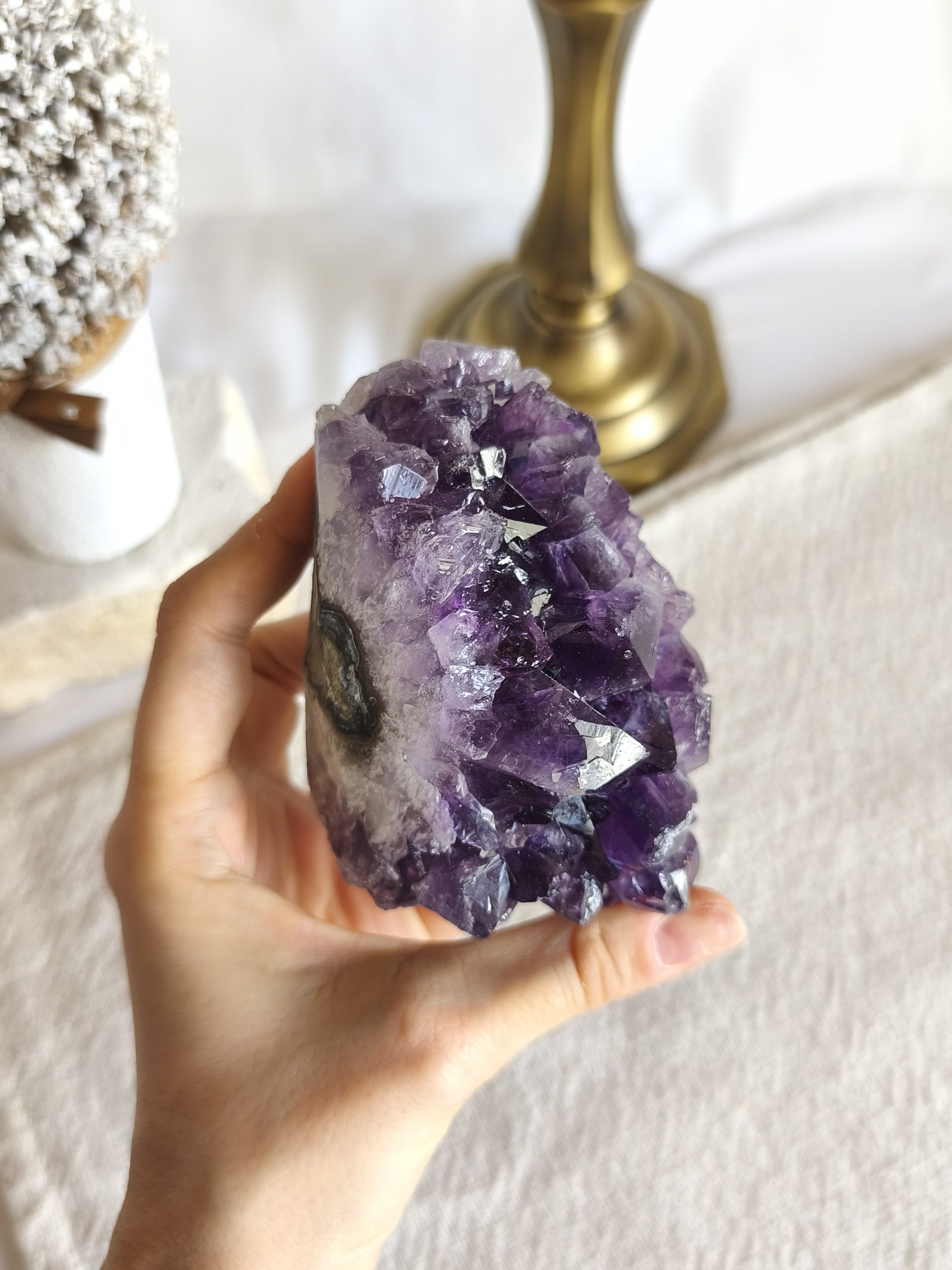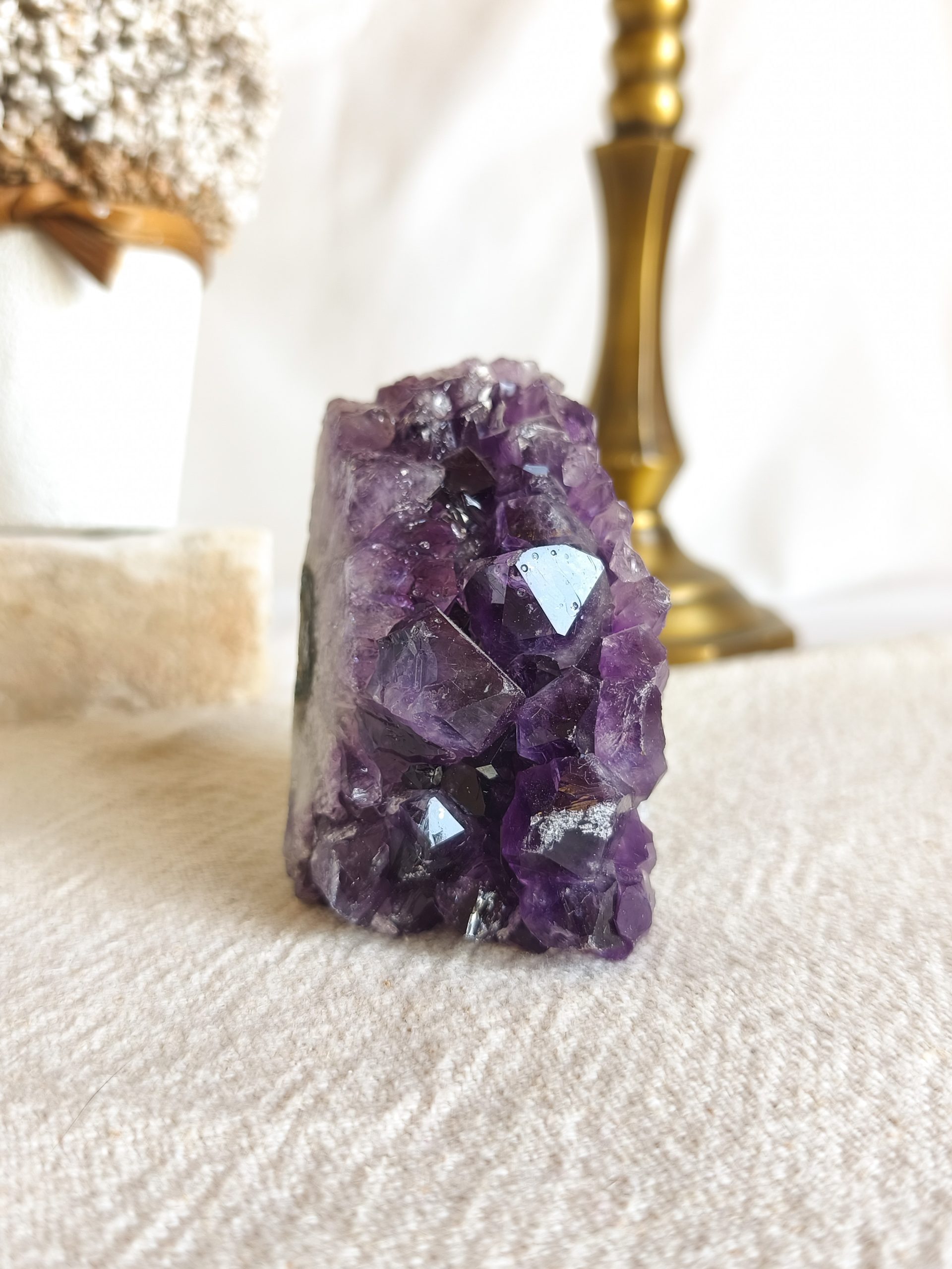 A Ametista é conhecida pela sua deslumbrante coloração roxa, que transmite uma sensação de tranquilidade e espiritualidade. Ainda mais, quando esculpida numa Drusa, a Ametista revela toda a sua majestade natural. Nesse sentido, cada Drusa é única, com cristais brilhantes e facetas que captam a luz de maneira deslumbrante.