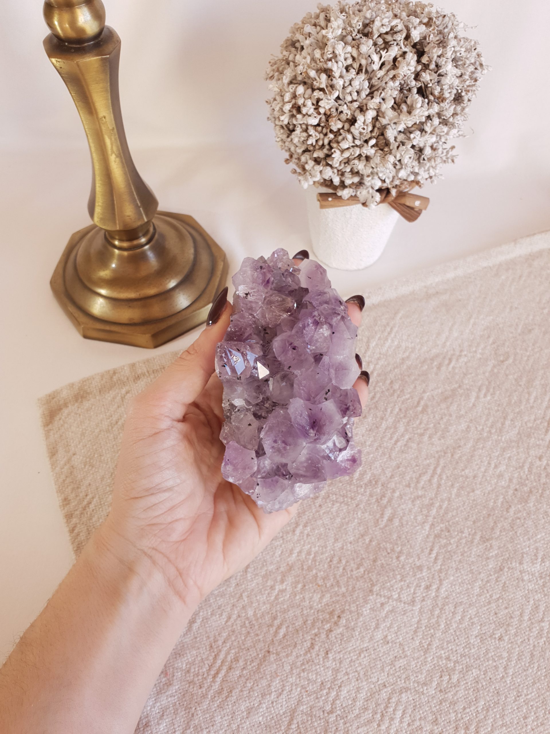 A Ametista é conhecida pela sua deslumbrante coloração roxa, que transmite uma sensação de tranquilidade e espiritualidade. Ainda mais, quando esculpida numa Drusa, a Ametista revela toda a sua majestade natural. Nesse sentido, cada Drusa é única, com cristais brilhantes e facetas que captam a luz de maneira deslumbrante.