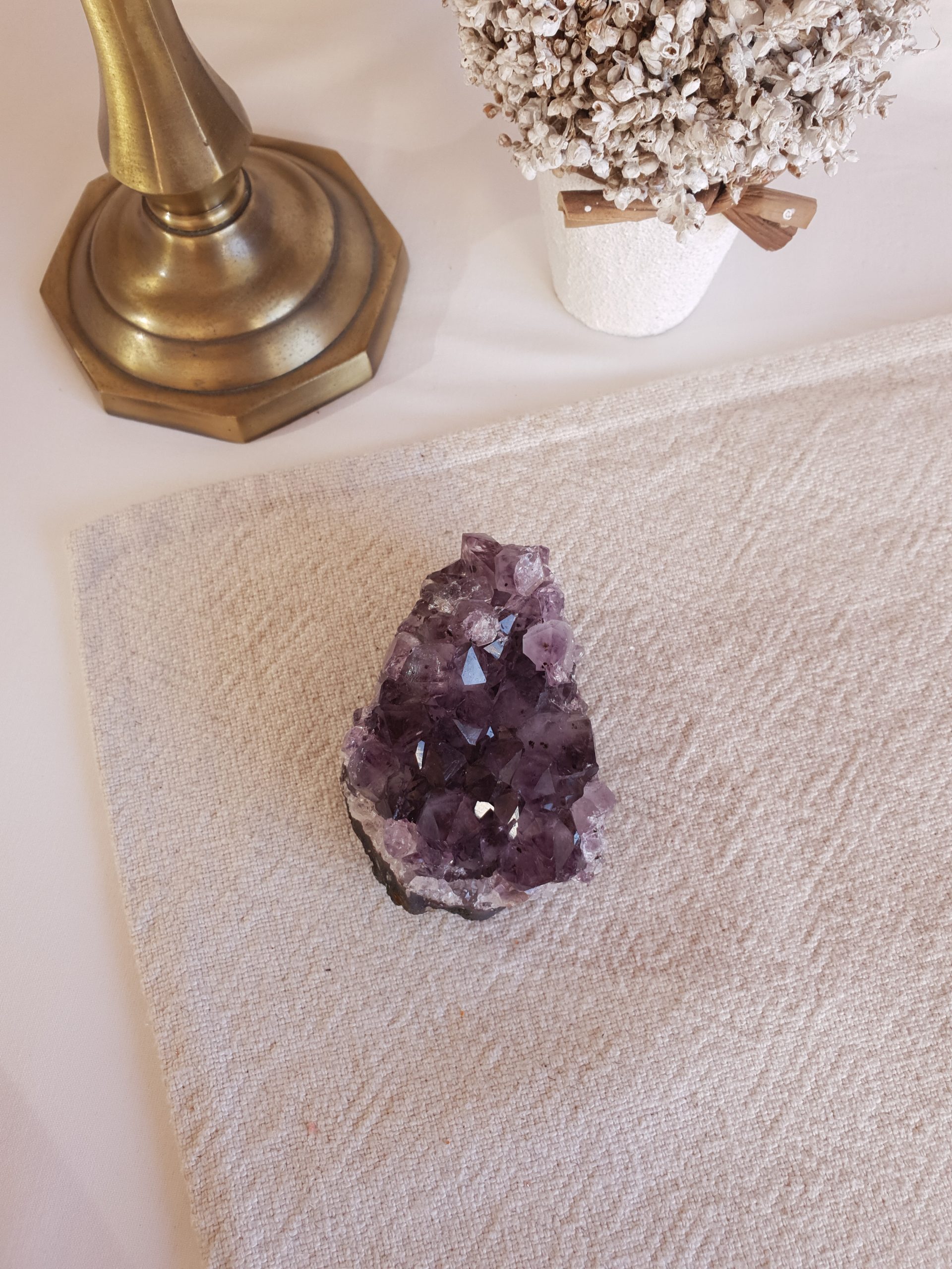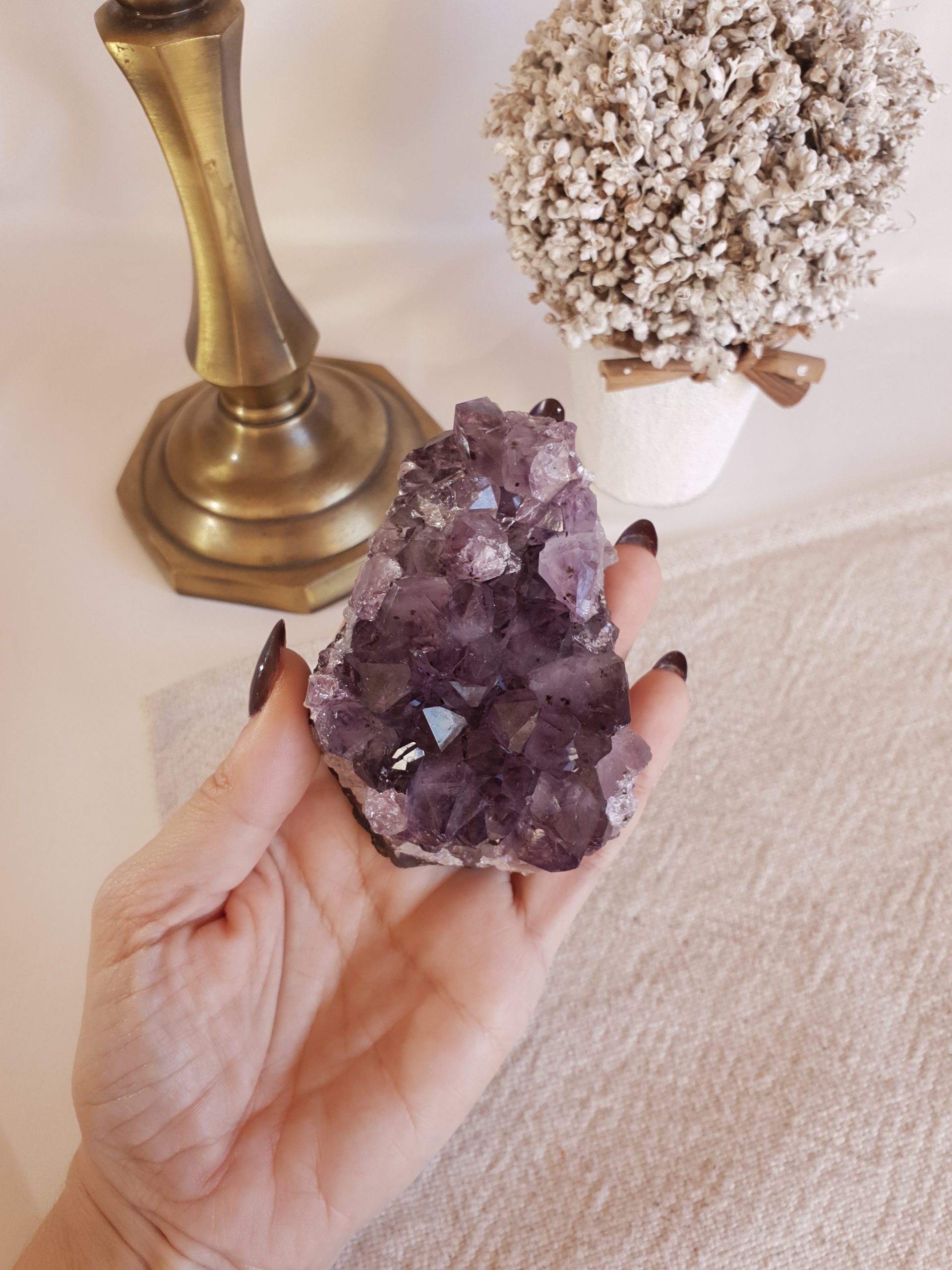 A Ametista é conhecida pela sua deslumbrante coloração roxa, que transmite uma sensação de tranquilidade e espiritualidade. Ainda mais, quando esculpida numa Drusa, a Ametista revela toda a sua majestade natural. Nesse sentido, cada Drusa é única, com cristais brilhantes e facetas que captam a luz de maneira deslumbrante.