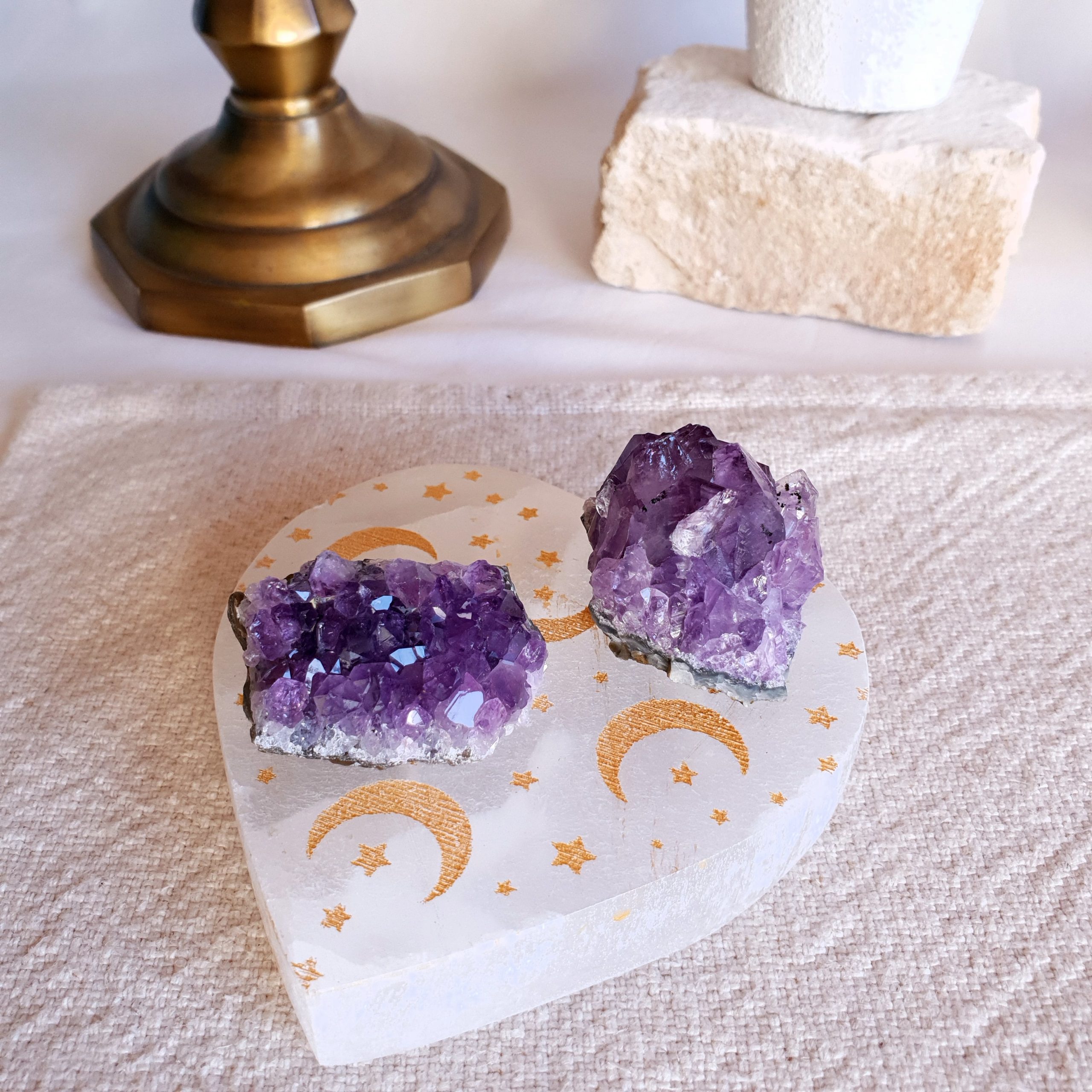 A Ametista é conhecida pela sua deslumbrante coloração roxa, que transmite uma sensação de tranquilidade e espiritualidade. Ainda mais, quando esculpida numa Drusa, a Ametista revela toda a sua majestade natural. Nesse sentido, cada Drusa é única, com cristais brilhantes e facetas que captam a luz de maneira deslumbrante.