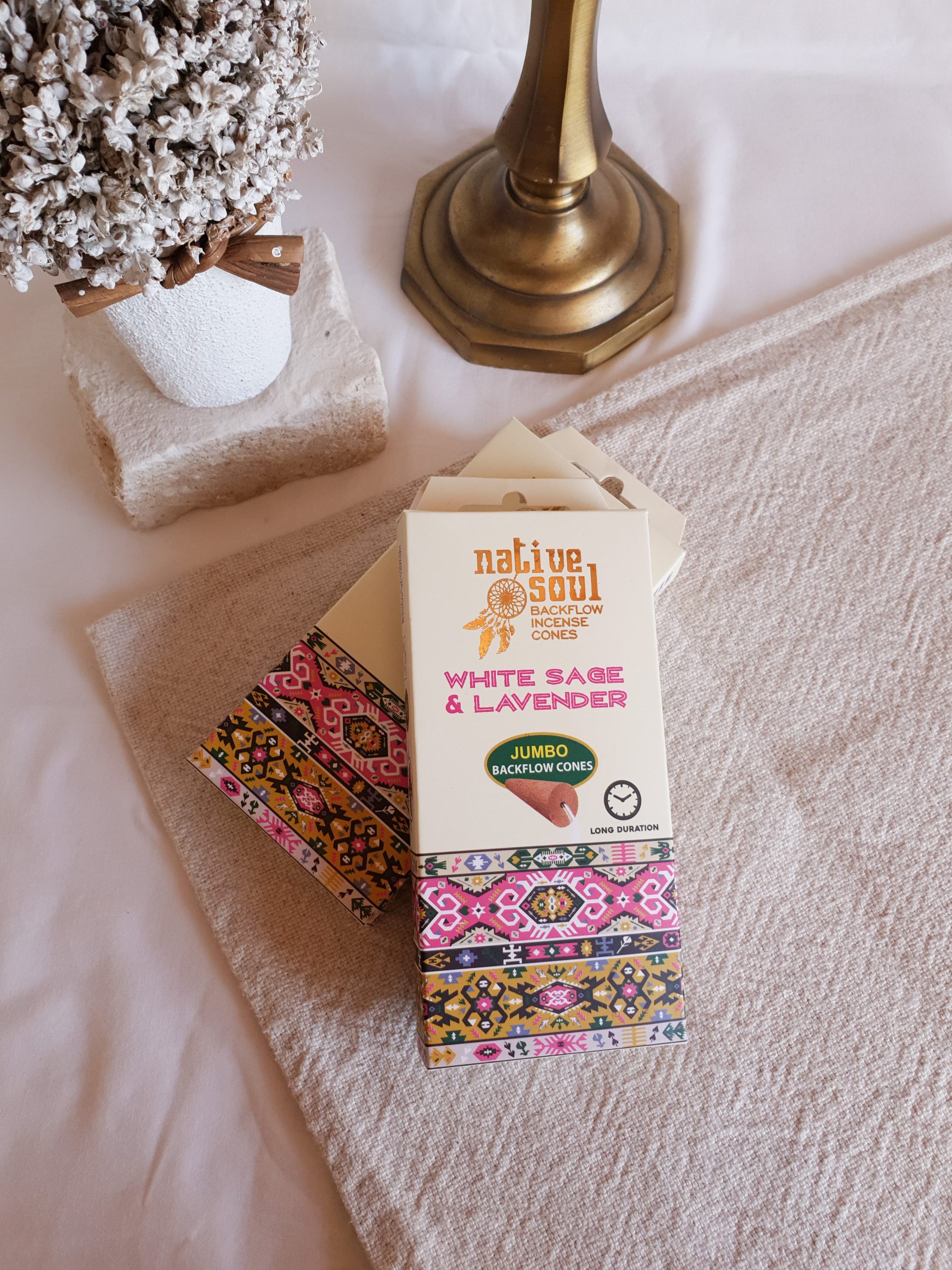 Estes incensos em cone da native soul combinam as propriedades purificadoras da sálvia branca com os efeitos calmantes da lavanda.