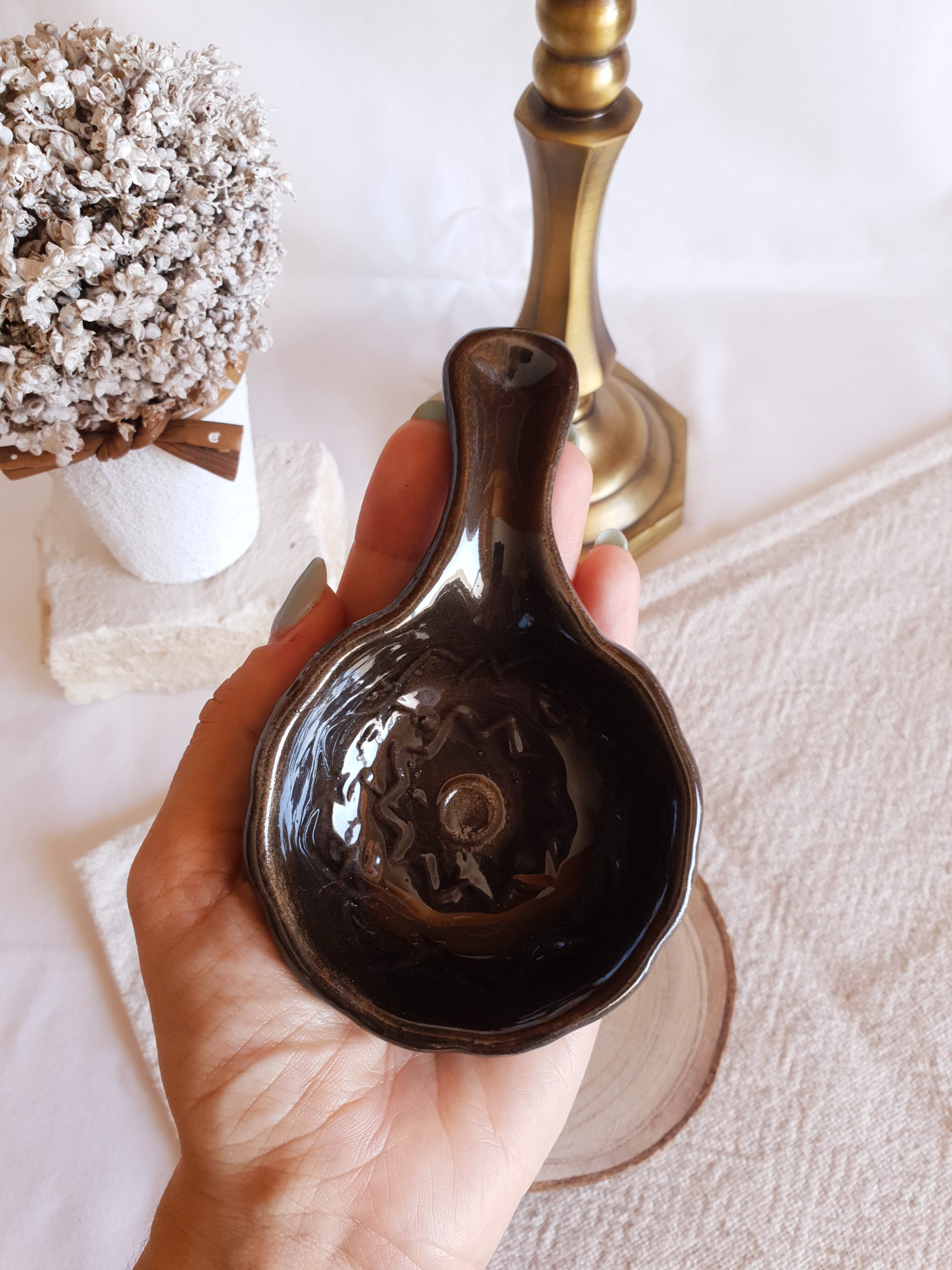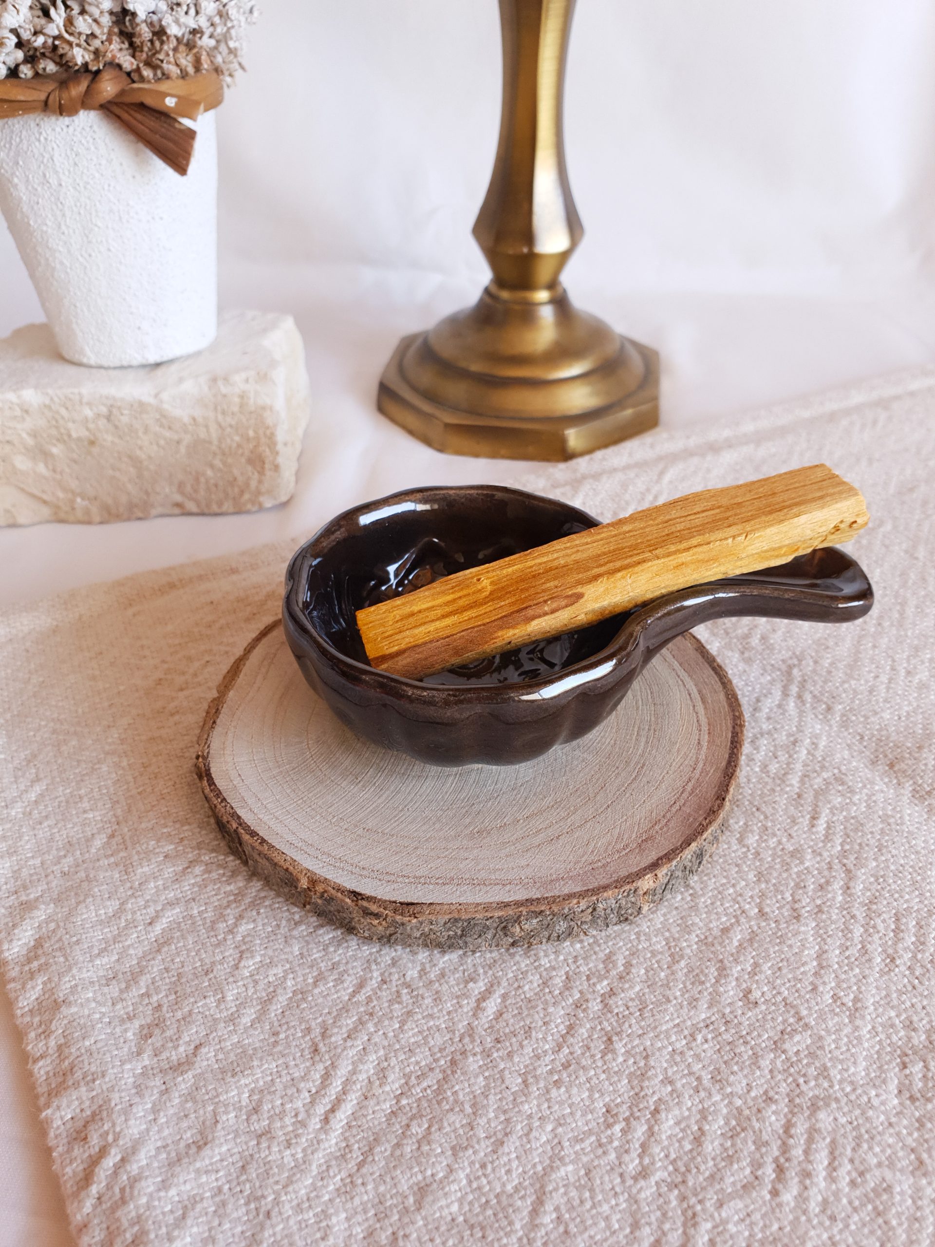 Este queimador foi projetado para queimar incensos em formato de vareta (sticks). É uma peça feita em cerâmica e que possui um suporte onde a vareta de incenso é colocada e acesa.